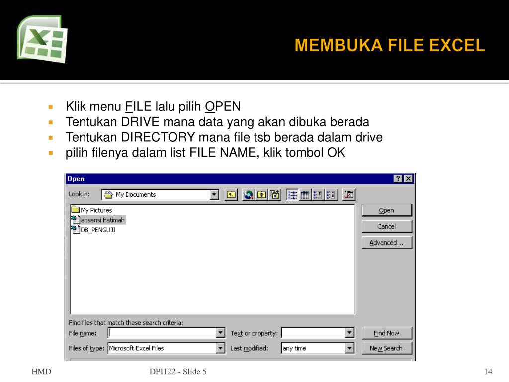 MEMBUKA FILE EXCEL • Klik menu FILE lalu pilih OPEN • Tentukan DRIVE mana data yang akan dibuka berada • Tentukan DIRECTORY mana file tsb berada dalam drive • pilih filenya dalam list FILE NAME, klik tombol OK DPI122 - Slide 5