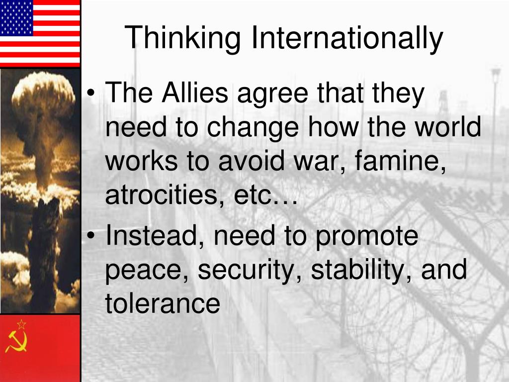 Thinking Internationally • The Allies agree that they need to change how the world works to avoid war, famine, atrocities, etc… • Instead, need to promote peace, security, stability, and tolerance