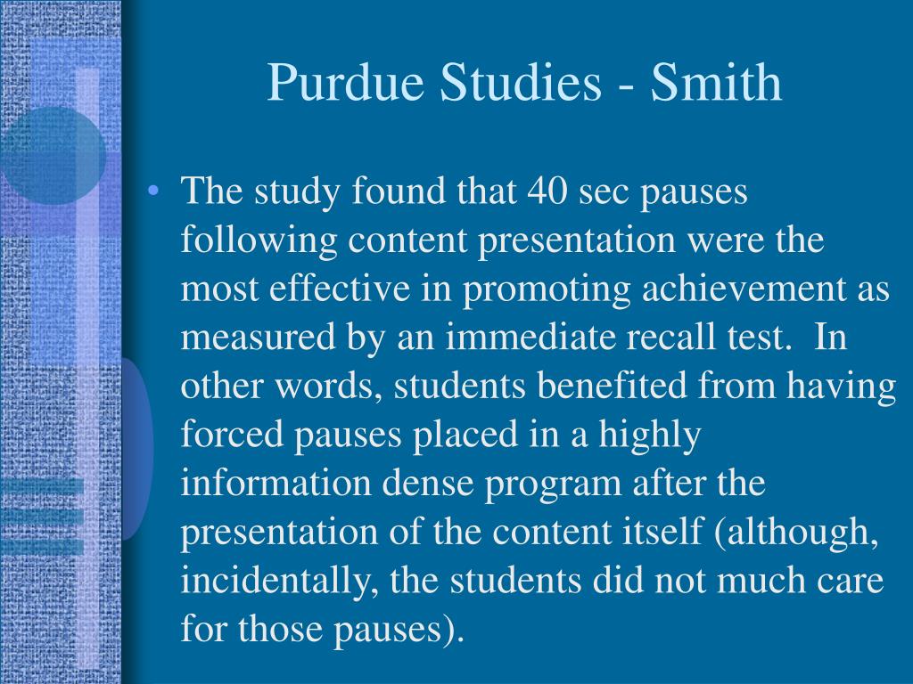 Purdue Studies - Smith • The study found that 40 sec pauses following content presentation were the most effective in promoting achievement as measured by an immediate recall test. In other words, students benefited from having forced pauses placed in a highly information dense program after the presentation of the content itself (although, incidentally, the students did not much care for those pauses).
