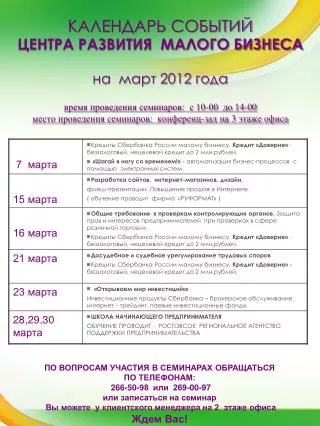 КАЛЕНДАРЬ СОБЫТИЙ ЦЕНТРА РАЗВИТИЯ МАЛОГО БИЗНЕСА на март 2012 года время проведения семинаров: с 10-00 до 14-00 место проведения семинаров: конференц-зал на 3 этаже офиса. ПО ВОПРОСАМ УЧАСТИЯ В СЕМИНАРАХ ОБРАЩАТЬСЯ ПО ТЕЛЕФОНАМ: 266-50-98 или 269-00-97 или записаться на семинар