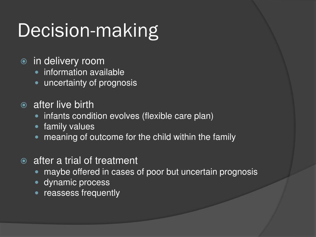 Decision-making • in delivery room • information available • uncertainty of prognosis • after live birth • infants condition evolves (flexible care plan) • family values • meaning of outcome for the child within the family • after a trial of treatment • maybe offered in cases of poor but uncertain prognosis • dynamic process • reassess frequently