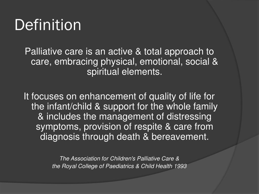 Definition Palliative care is an active & total approach to care, embracing physical, emotional, social & spiritual elements. It focuses on enhancement of quality of life for the infant/child & support for the whole family & includes the management of distressing symptoms, provision of respite & care from diagnosis through death & bereavement. The Association for Children's Palliative Care & the Royal College of Paediatrics & Child Health 1993