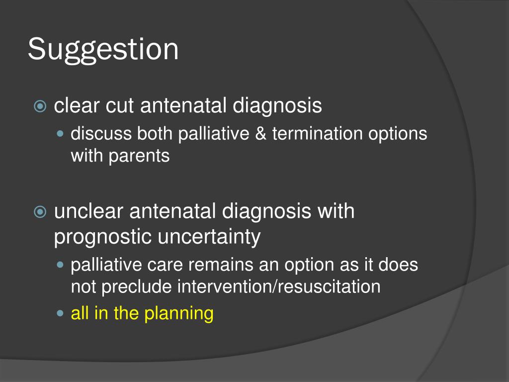 Suggestion • clear cut antenatal diagnosis • discuss both palliative & termination options with parents • unclear antenatal diagnosis with prognostic uncertainty • palliative care remains an option as it does not preclude intervention/resuscitation • all in the planning
