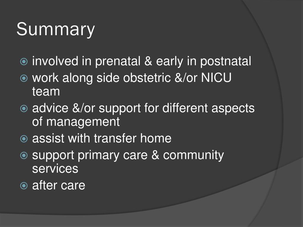 Summary • involved in prenatal & early in postnatal • work along side obstetric &/or NICU team • advice &/or support for different aspects of management • assist with transfer home • support primary care & community services • after care