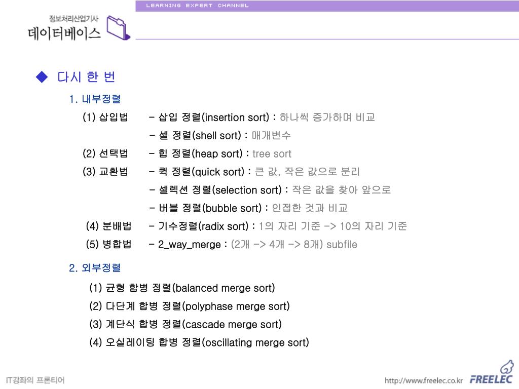 ◆ 다시 한 번 1. 내부정렬 (1) 삽입법 - 삽입 정렬(insertion sort) : 하나씩 증가하며 비교 - 셀 정렬(shell sort) : 매개변수 (2) 선택법 - 힙 정렬(heap sort) : tree sort (3) 교환법 - 퀵 정렬(quick sort) : 큰 값, 작은 값으로 분리 - 셀렉션 정렬(selection sort) : 작은 값을 찾아 앞으로 - 버블 정렬(bubble sort) : 인접한 것과 비교 (4) 분배법 - 기수정렬(radix sort) : 1의 자리 기준 -> 10의 자리 기준 (5) 병합법 - 2_way_merge : (2개 -> 4개 -> 8개) subfile 2. 외부정렬 (1) 균형 합병 정렬(balanced merge sort) (2) 다단계 합병 정렬(polyphase merge sort) (3) 계단식 합병 정렬(cascade merge sort) (4) 오실레이팅 합병 정렬(oscillating merge sort)