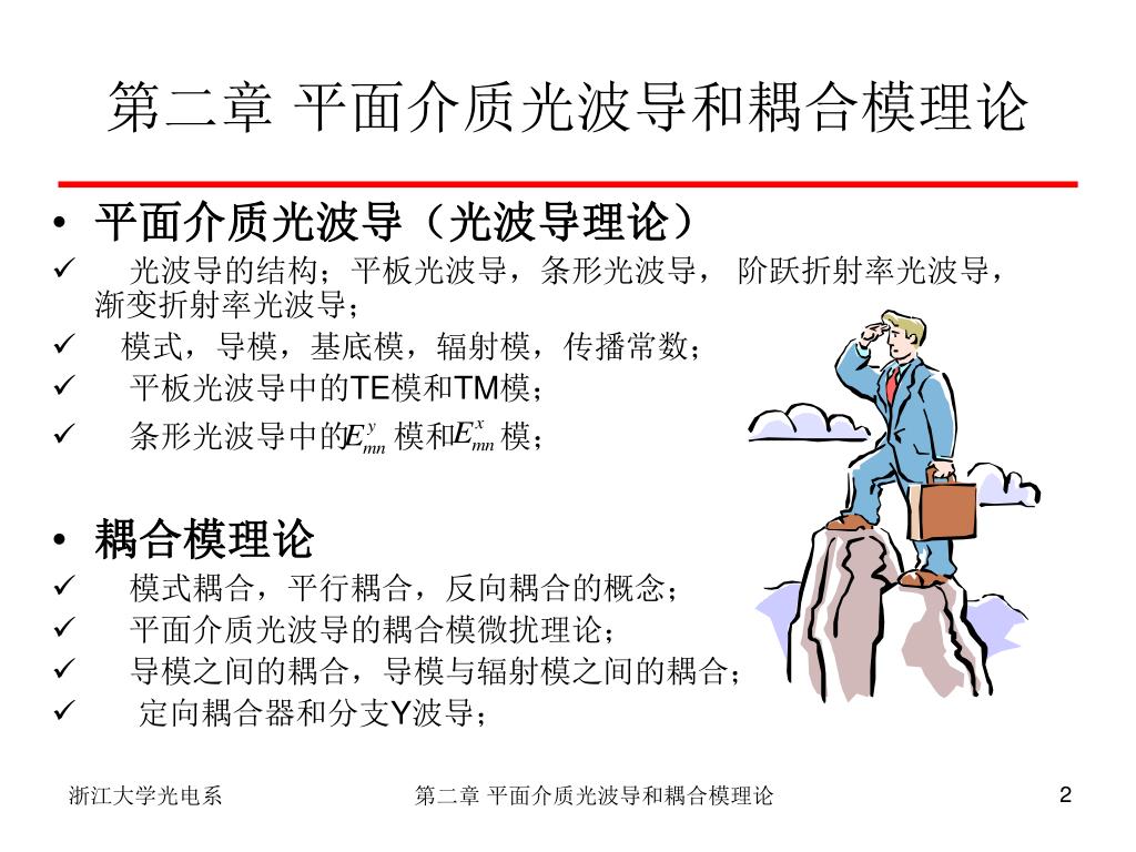 浙江大学光电信息工程学系 《 集成光电子器件及设计 》. 第二章 平面介质光波导和耦合模理论. 浙江大学光电系:时尧成 yaocheng@zju.edu.cn 13732241781 http://mypage.zju.edu.cn/yaocheng. 第二章 平面介质光波导和耦合模理论. 平面介质光波导(光波导理论) 光波导的结构;平板光波导,条形光波导, 阶跃折射率光波导, 渐变折射率光波导; 模式,导模,基底模,辐射模,传播常数; 平板光波导中的 TE 模和 TM 模;