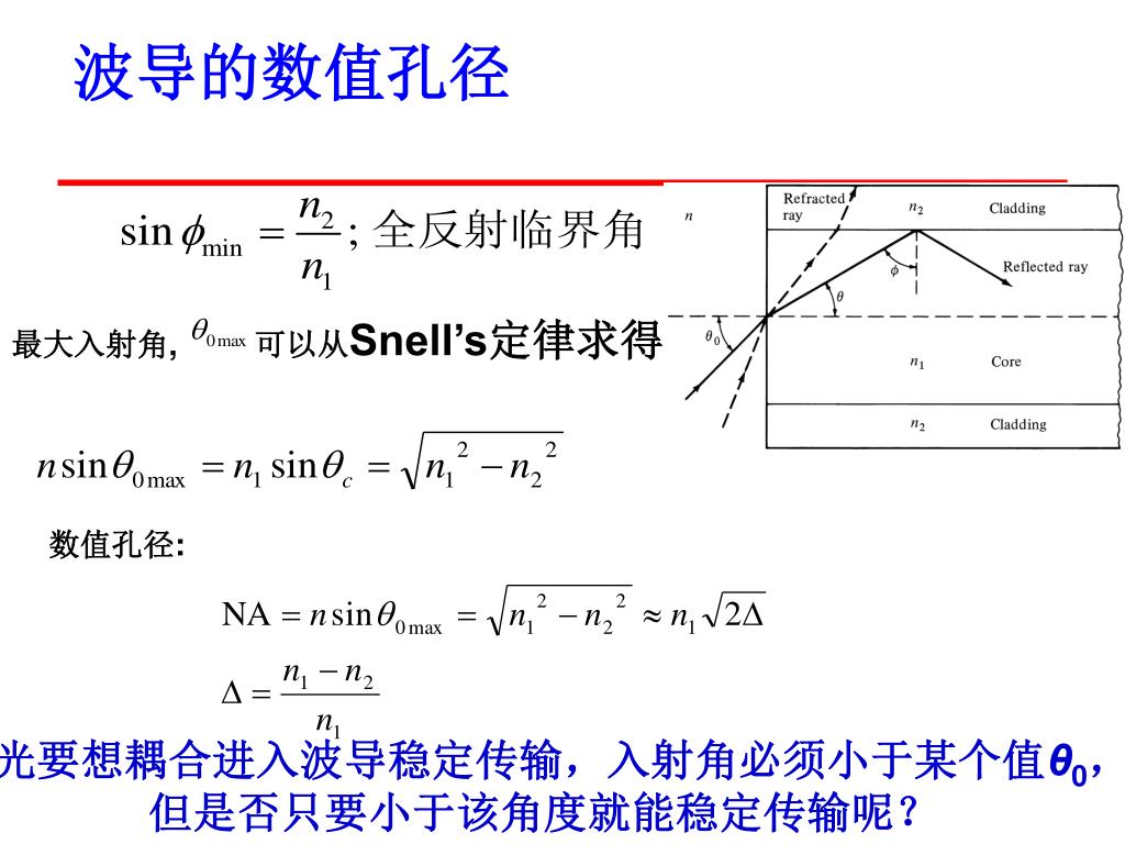波导的数值孔径 最大入射角, 可以从Snell’s定律求得 数值孔径: 光要想耦合进入波导稳定传输,入射角必须小于某个值θ0,但是否只要小于该角度就能稳定传输呢?