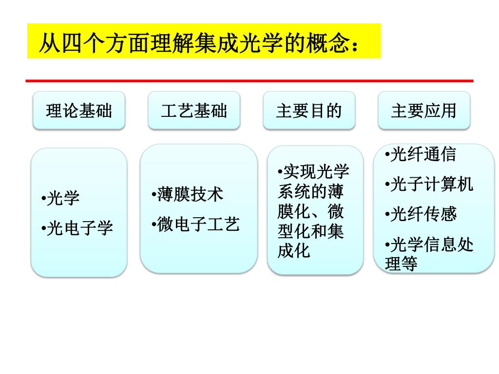 从四个方面理解集成光学的概念: 理论基础 工艺基础 主要目的 主要应用 • 光纤通信 • 光子计算机 • 光纤传感 • 光学信息处理等 • 薄膜技术 • 微电子工艺 • 实现光学系统的薄膜化、微型化和集成化 • 光学 • 光电子学
