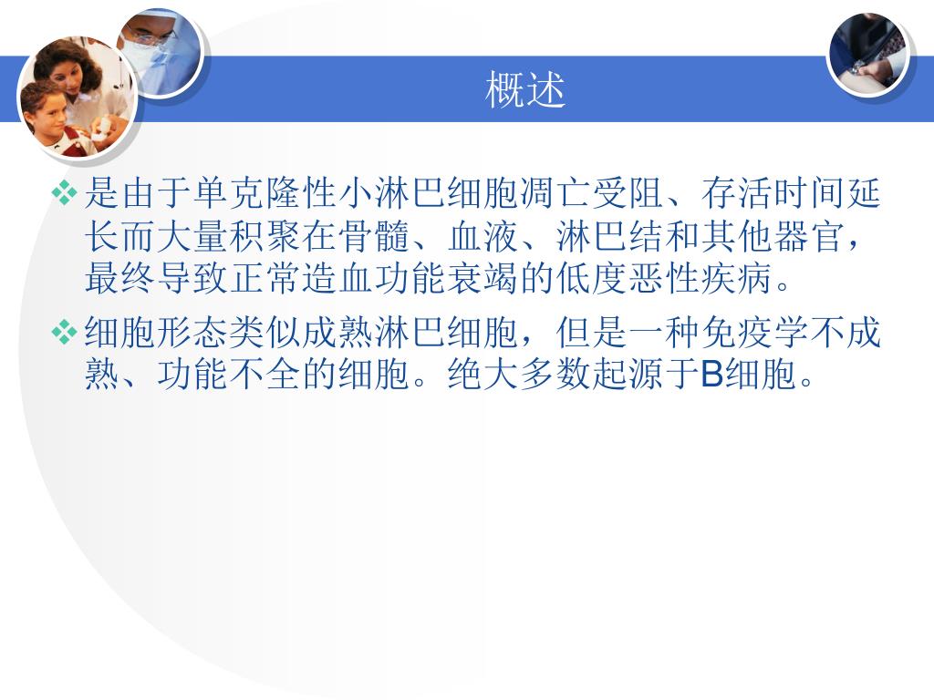 概述 • 是由于单克隆性小淋巴细胞凋亡受阻、存活时间延长而大量积聚在骨髓、血液、淋巴结和其他器官,最终导致正常造血功能衰竭的低度恶性疾病。 • 细胞形态类似成熟淋巴细胞,但是一种免疫学不成熟、功能不全的细胞。绝大多数起源于B细胞。