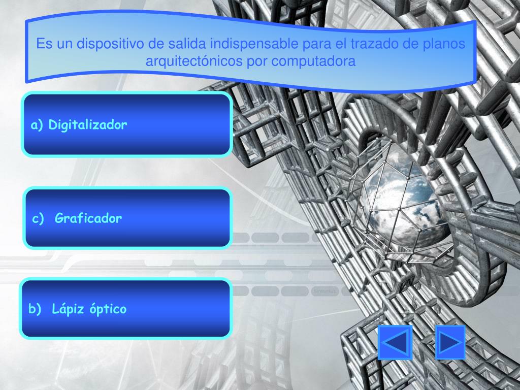 Es un dispositivo de salida indispensable para el trazado de planos arquitectónicos por computadora a) Digitalizador c) Graficador b) Lápiz óptico