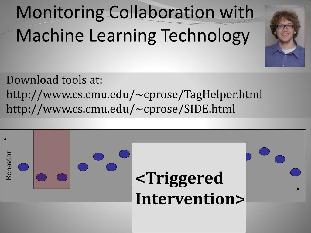 Labeled Texts Labeled Texts TagHelper Behavior Unlabeled Texts A Model that can Label More Texts Time Monitoring Collaboration with Machine Learning Technology Download tools at: http://www.cs.cmu.edu/~cprose/TagHelper.html http://www.cs.cmu.edu/~cprose/SIDE.html <Triggered Intervention>