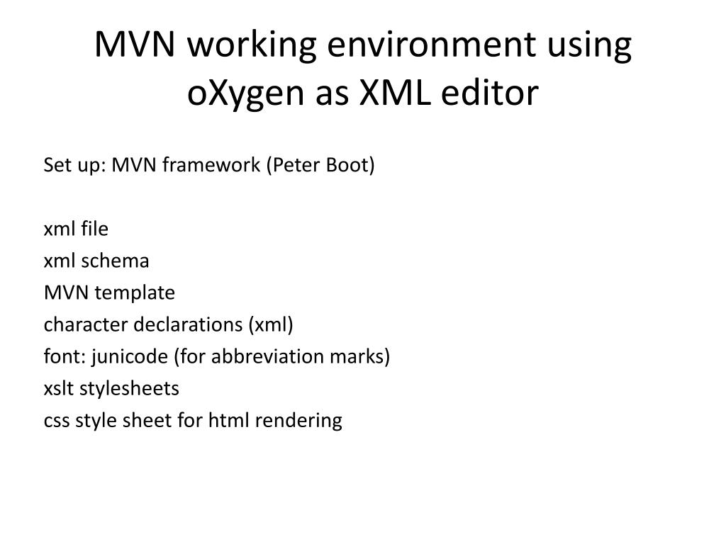 MVN working environment usingoXygen as XML editor Set up: MVN framework (Peter Boot) xml file xml schema MVN template characterdeclarations(xml) font: junicode (forabbreviationmarks) xsltstylesheets cssstyle sheet for html rendering