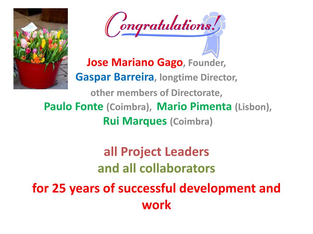 Jose Mariano Gago, Founder,Gaspar Barreira, longtimeDirector, othermembersofDirectorate, Paulo Fonte (Coimbra), Mario Pimenta (Lisbon),Rui Marques (Coimbra) all Project Leadersand all collaborators for 25 yearsofsuccessfuldevelopmentandwork
