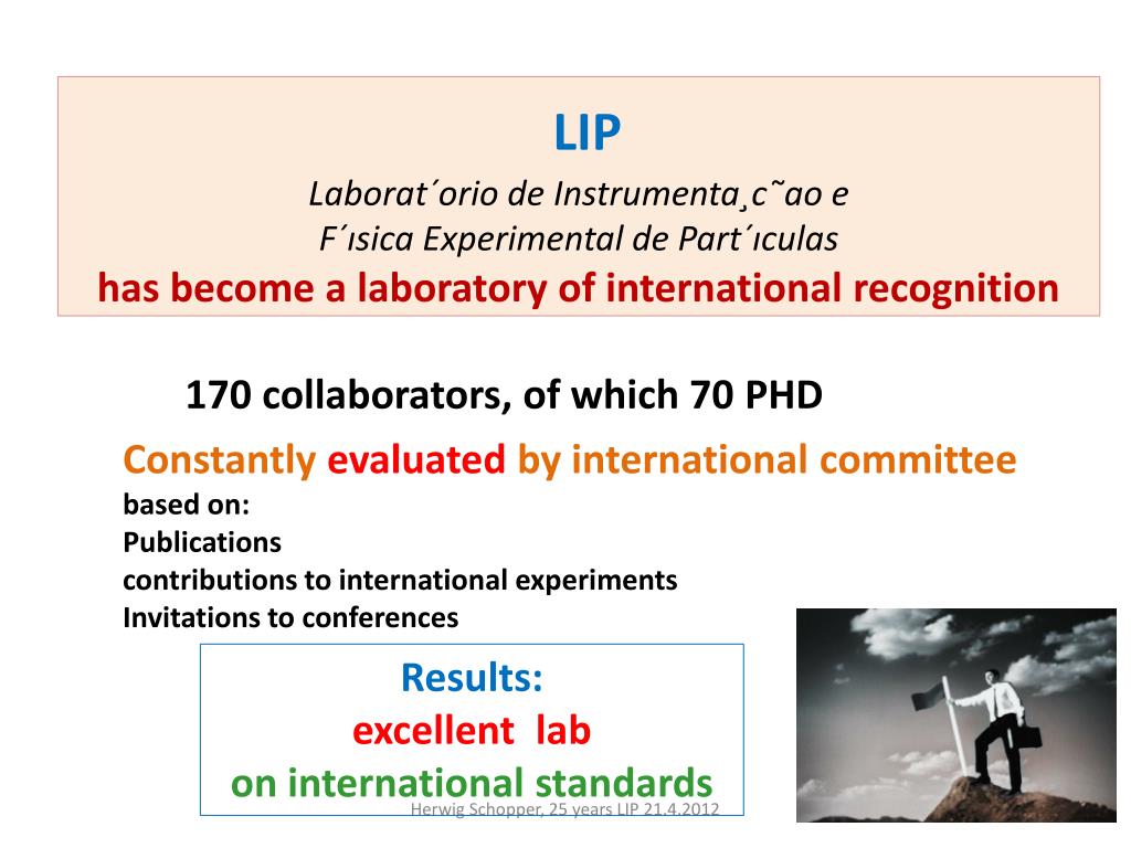 LIP Laborat´orio de Instrumenta¸c˜ao eF´ısica Experimental de Part´ıculashas become a laboratory of international recognition 170 collaborators, of which 70 PHD Constantly evaluated by international committeebased on: Publicationscontributions to international experiments Invitations to conferences • Results: excellent lab on international standards Herwig Schopper, 25 years LIP 21.4.2012