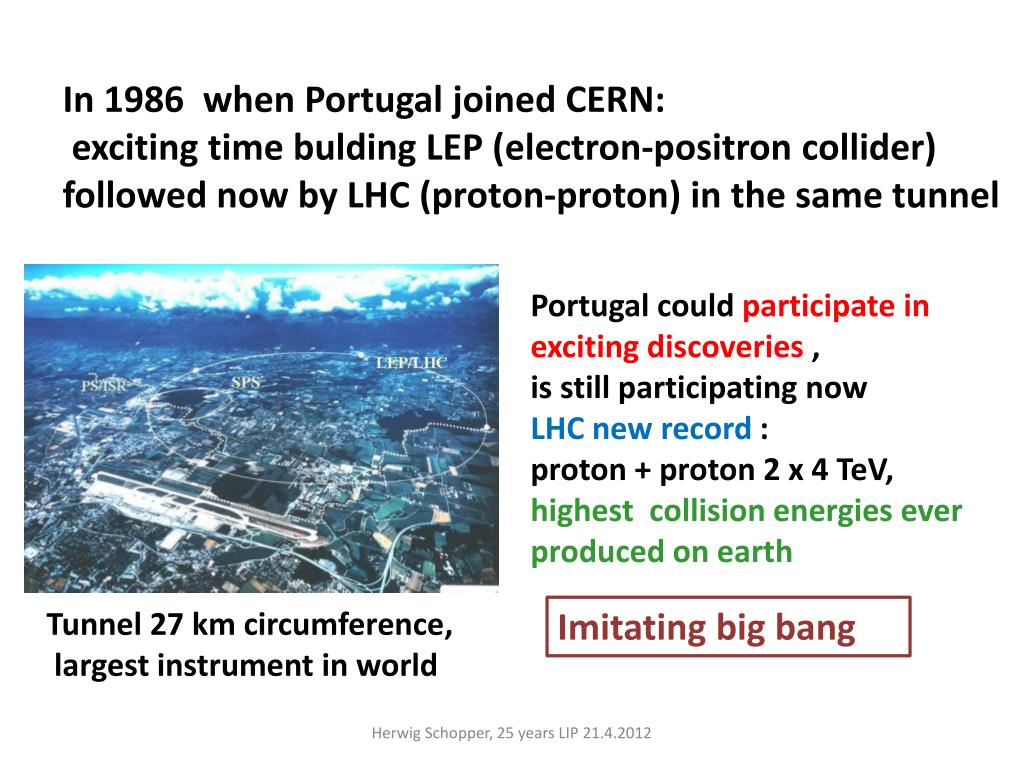 In 1986 when Portugal joined CERN:exciting time bulding LEP (electron-positron collider)followednowby LHC (proton-proton) in the same tunnel Portugal couldparticipate in excitingdiscoveries,is still participatingnowLHC newrecord: proton + proton 2 x 4 TeV, highestcollisionenergieseverproduced on earth Imitating big bang Tunnel 27 km circumference, largest instrument in world Herwig Schopper, 25 years LIP 21.4.2012