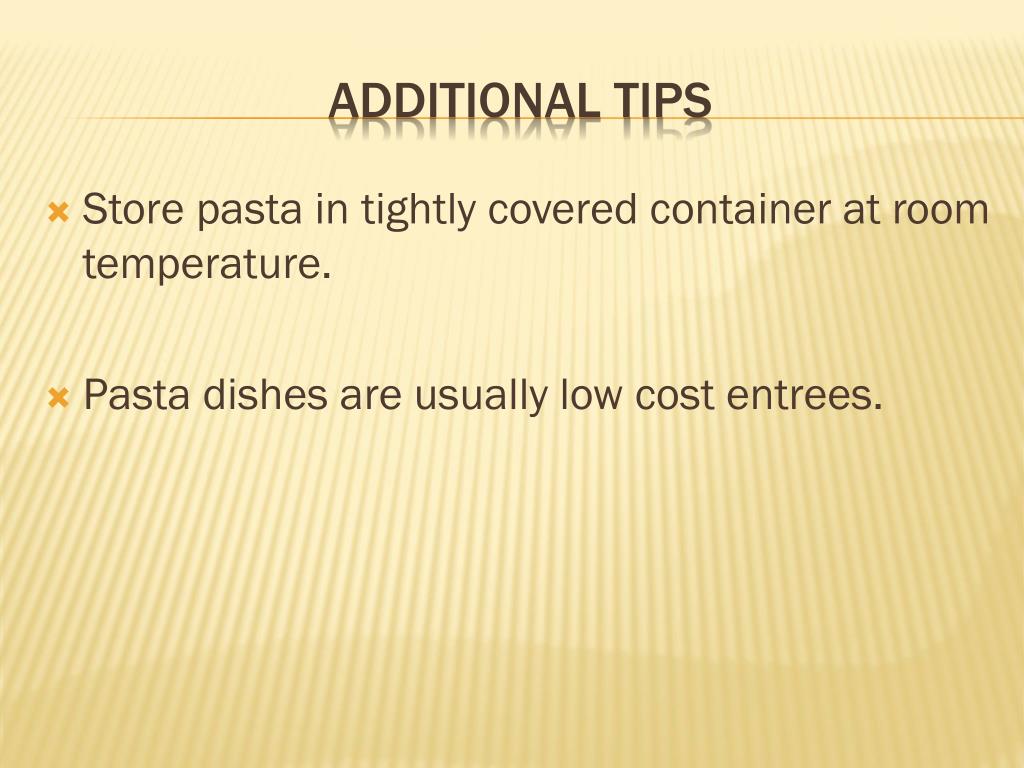 Store pasta in tightly covered container at room temperature. Pasta dishes are usually low cost entrees. Additional Tips