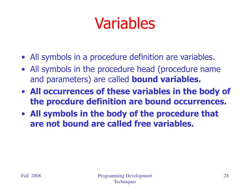 Variables • All symbols in a procedure definition are variables. • All symbols in the procedure head (procedure name and parameters) are called bound variables. • All occurrences of these variables in the body of the procdure definition are bound occurrences. • All symbols in the body of the procedure that are not bound are called free variables. Programming Development Techniques