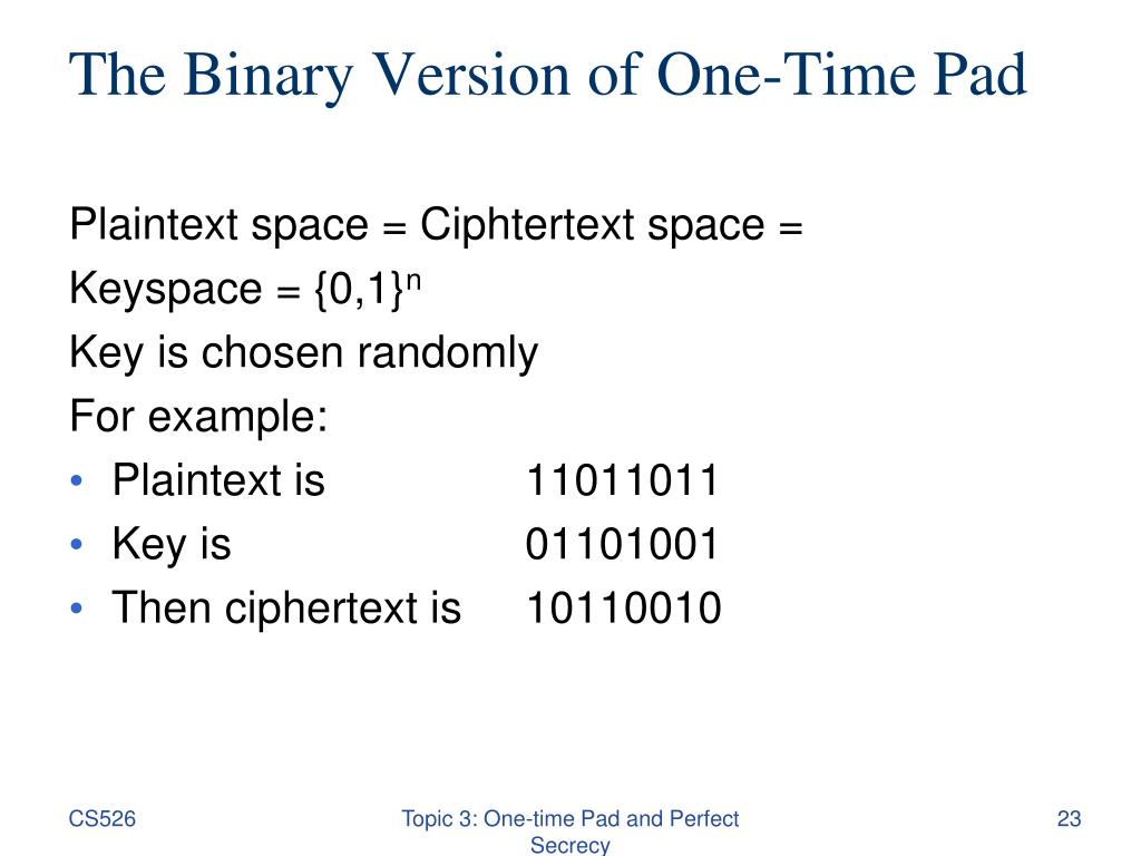 The Binary Version of One-Time Pad Plaintext space = Ciphtertext space = Keyspace = {0,1}n Key is chosen randomly For example: • Plaintext is 11011011 • Key is 01101001 • Then ciphertext is 10110010 Topic 3: One-time Pad and Perfect Secrecy