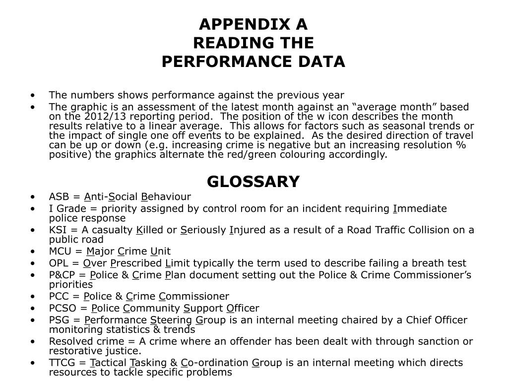 APPENDIX AREADING THE PERFORMANCE DATA • The numbers shows performance against the previous year • The graphic is an assessment of the latest month against an “average month” based on the 2012/13 reporting period. The position of the w icon describes the month results relative to a linear average. This allows for factors such as seasonal trends or the impact of single one off events to be explained. As the desired direction of travel can be up or down (e.g. increasing crime is negative but an increasing resolution % positive) the graphics alternate the red/green colouring accordingly. GLOSSARY • ASB = Anti-Social Behaviour • I Grade = priority assigned by control room for an incident requiring Immediate police response • KSI = A casualty Killed or Seriously Injured as a result of a Road Traffic Collision on a public road • MCU = Major Crime Unit • OPL = Over Prescribed Limit typically the term used to describe failing a breath test • P&CP = Police & Crime Plan document setting out the Police & Crime Commissioner’s priorities • PCC = Police & Crime Commissioner • PCSO = Police Community Support Officer • PSG = Performance Steering Group is an internal meeting chaired by a Chief Officer monitoring statistics & trends • Resolved crime = A crime where an offender has been dealt with through sanction or restorative justice. • TTCG = Tactical Tasking & Co-ordination Group is an internal meeting which directs resources to tackle specific problems