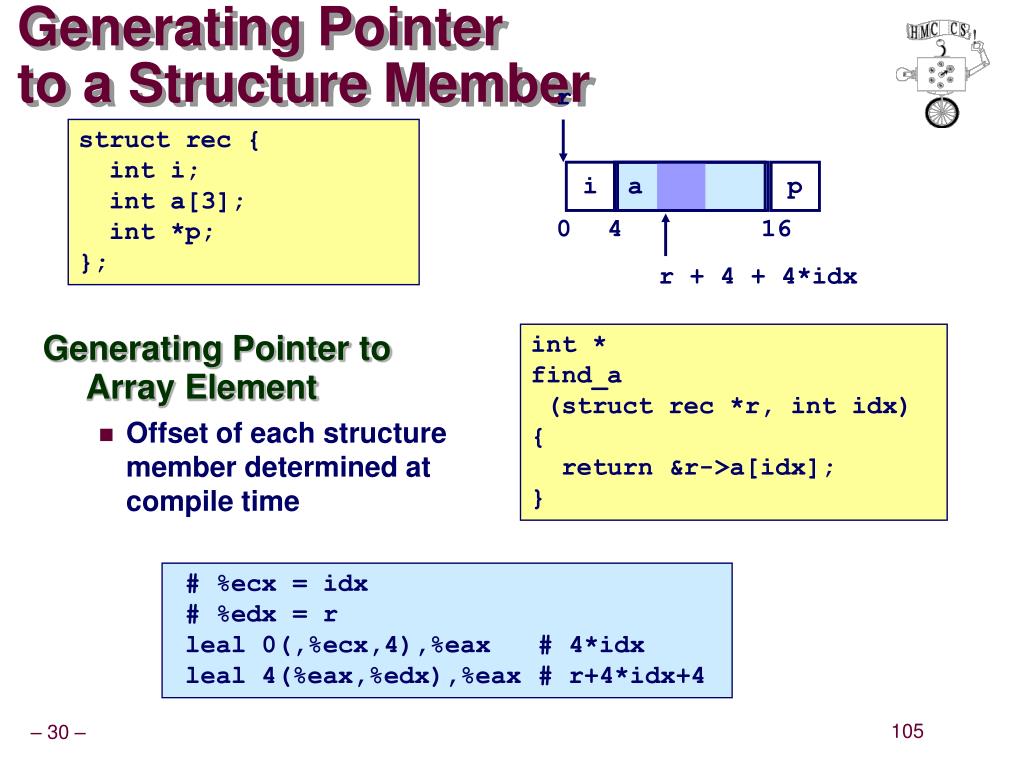 Generating Pointerto a Structure Member r struct rec { int i; int a[3]; int *p; }; • Generating Pointer to Array Element • Offset of each structure member determined at compile time i a p 0 4 16 r + 4 + 4*idx int * find_a (struct rec *r, int idx) { return &r->a[idx]; } # %ecx = idx # %edx = r leal 0(,%ecx,4),%eax # 4*idx leal 4(%eax,%edx),%eax # r+4*idx+4