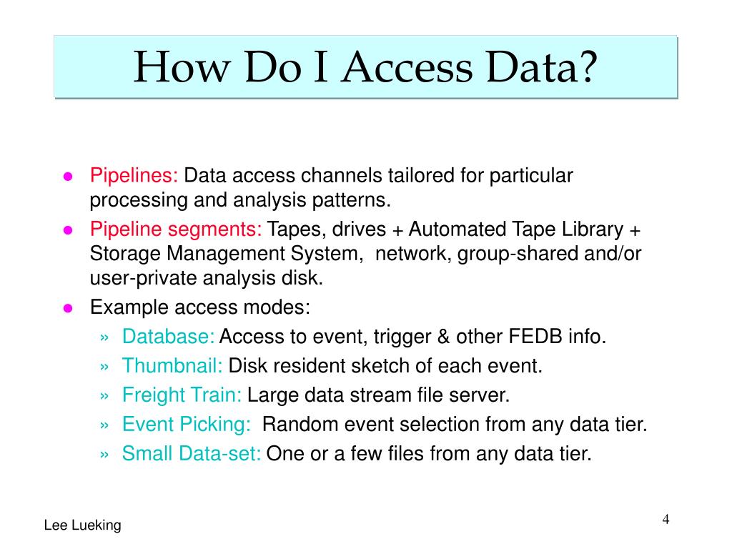 How Do I Access Data? • Pipelines: Data access channels tailored for particular processing and analysis patterns. • Pipeline segments: Tapes, drives + Automated Tape Library + Storage Management System, network, group-shared and/or user-private analysis disk. • Example access modes: • Database:Access to event, trigger & other FEDB info. • Thumbnail: Disk resident sketch of each event. • Freight Train: Large data stream file server. • Event Picking: Random event selection from any data tier. • Small Data-set:One or a few files from any data tier.