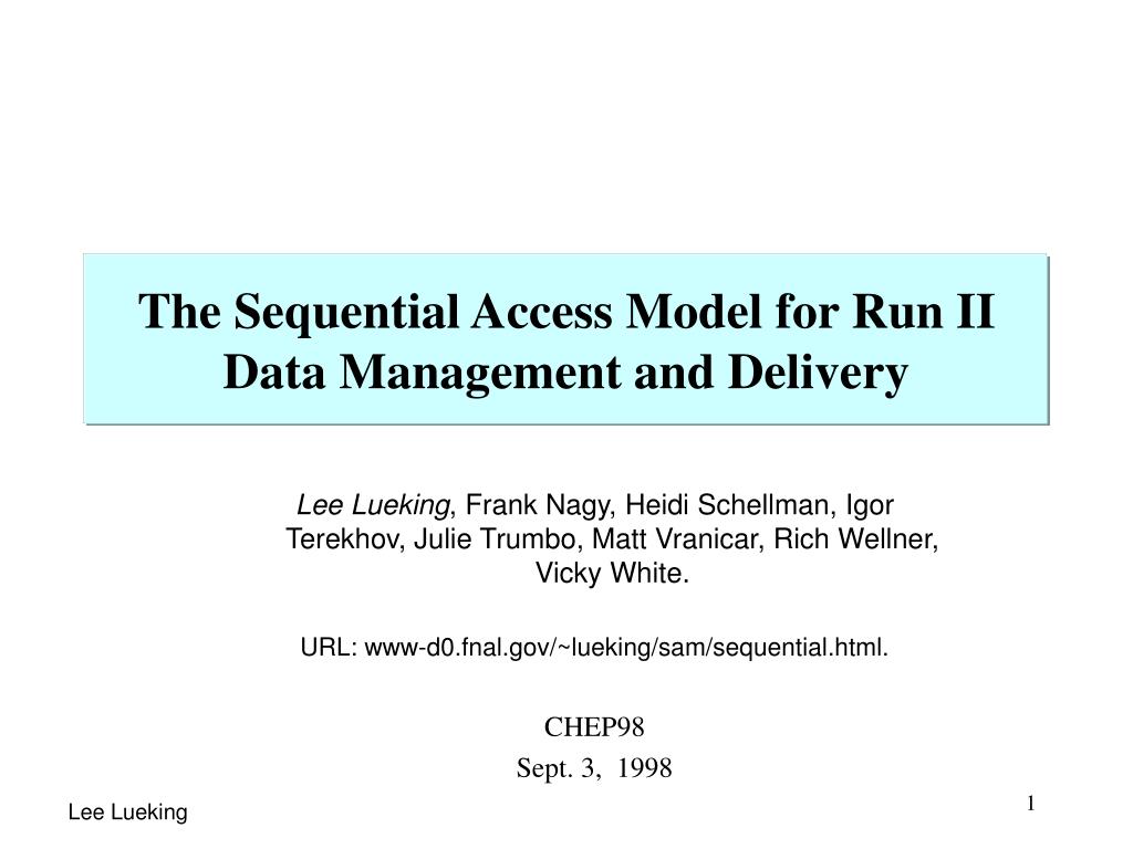 The Sequential Access Model for Run II Data Management and Delivery. Lee Lueking , Frank Nagy, Heidi Schellman, Igor Terekhov, Julie Trumbo, Matt Vranicar, Rich Wellner, Vicky White. URL: www-d0.fnal.gov/~lueking/sam/sequential.html. CHEP98 Sept. 3, 1998.