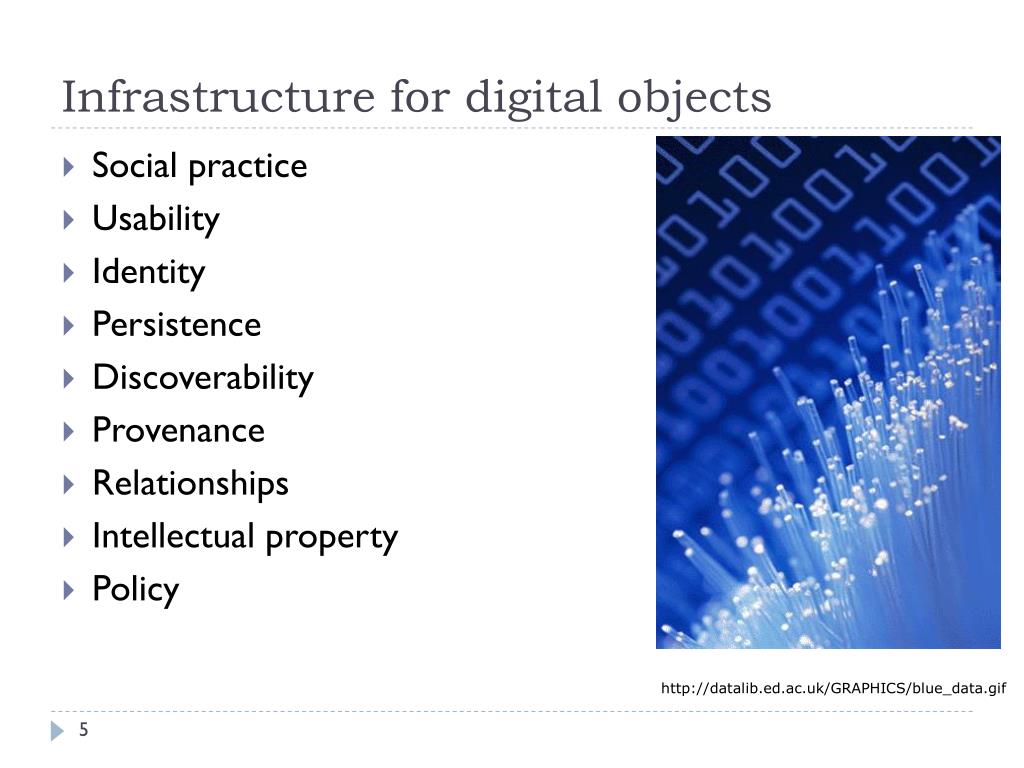 Infrastructure for digital objects • Social practice • Usability • Identity • Persistence • Discoverability • Provenance • Relationships • Intellectual property • Policy http://datalib.ed.ac.uk/GRAPHICS/blue_data.gif