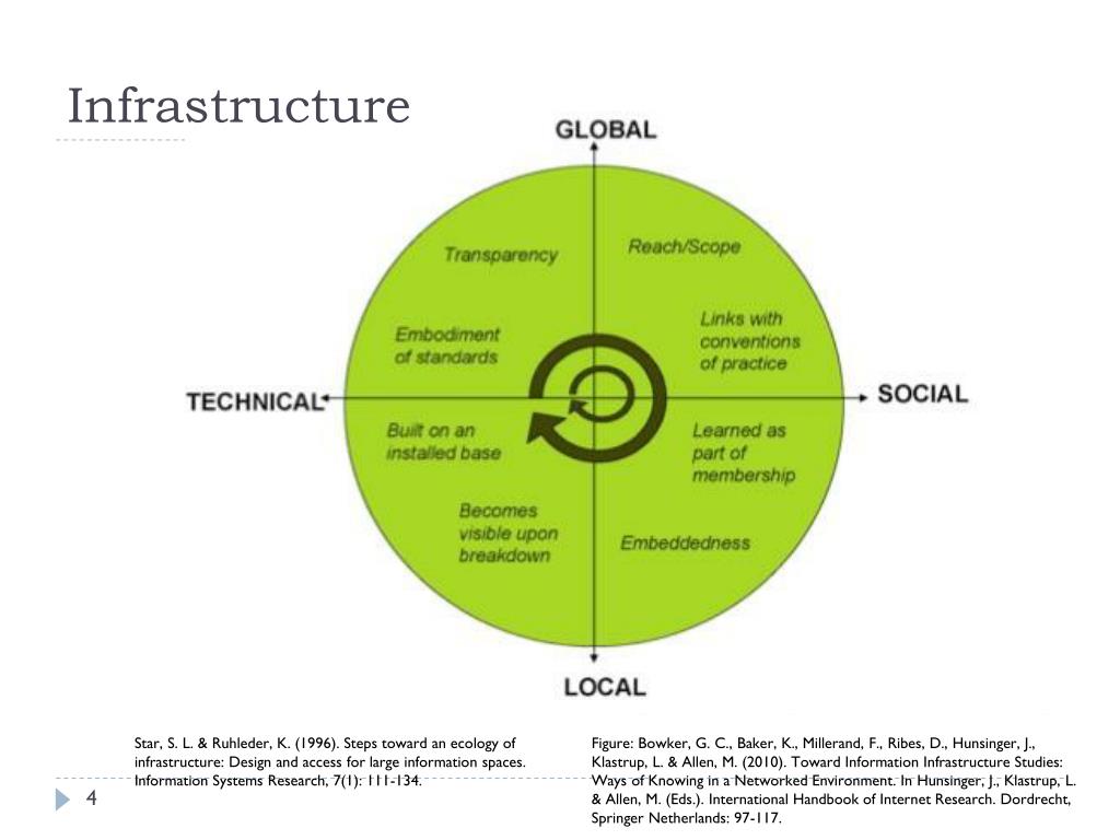 Infrastructure Star, S. L. & Ruhleder, K. (1996). Steps toward an ecology of infrastructure: Design and access for large information spaces. Information Systems Research, 7(1): 111-134. Figure: Bowker, G. C., Baker, K., Millerand, F., Ribes, D., Hunsinger, J., Klastrup, L. & Allen, M. (2010). Toward Information Infrastructure Studies: Ways of Knowing in a Networked Environment. In Hunsinger, J., Klastrup, L. & Allen, M. (Eds.). International Handbook of Internet Research. Dordrecht, Springer Netherlands: 97-117.