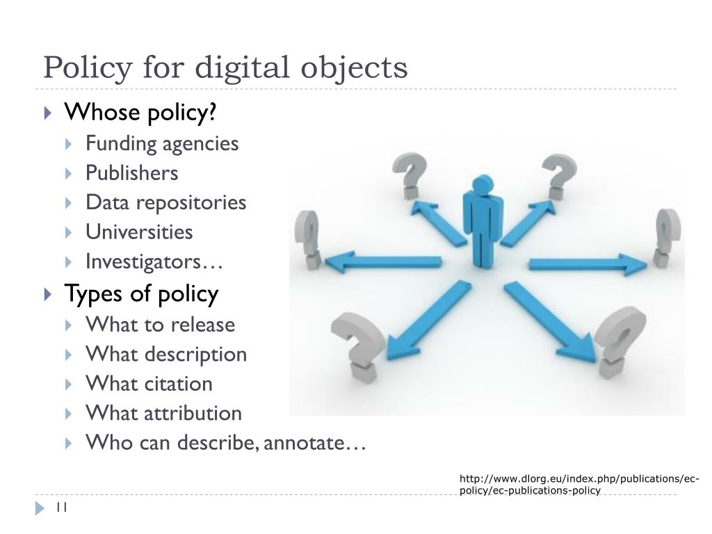 Policy for digital objects • Whose policy? • Funding agencies • Publishers • Data repositories • Universities • Investigators… • Types of policy • What to release • What description • What citation • What attribution • Who can describe, annotate… http://www.dlorg.eu/index.php/publications/ec-policy/ec-publications-policy