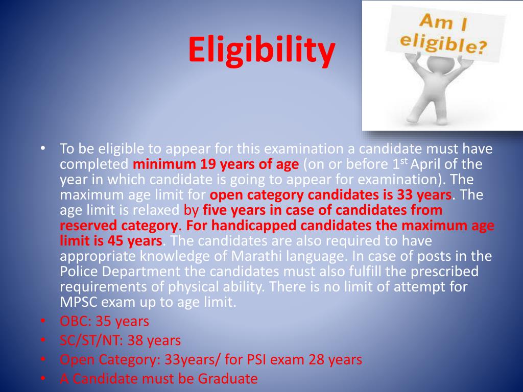 Eligibility • To be eligible to appear for this examination a candidate must have completed minimum 19 years of age (on or before 1st April of the year in which candidate is going to appear for examination). The maximum age limit for open category candidates is 33 years. The age limit is relaxed by five yearsin case of candidates from reserved category. For handicappedcandidates the maximum age limit is 45 years. The candidates are also required to have appropriate knowledge of Marathi language. In case of posts in the Police Department the candidates must also fulfill the prescribed requirements of physical ability. There is no limit of attempt for MPSC exam up to age limit. • OBC: 35 years • SC/ST/NT: 38 years • Open Category: 33years/ for PSI exam 28 years • A Candidate must be Graduate
