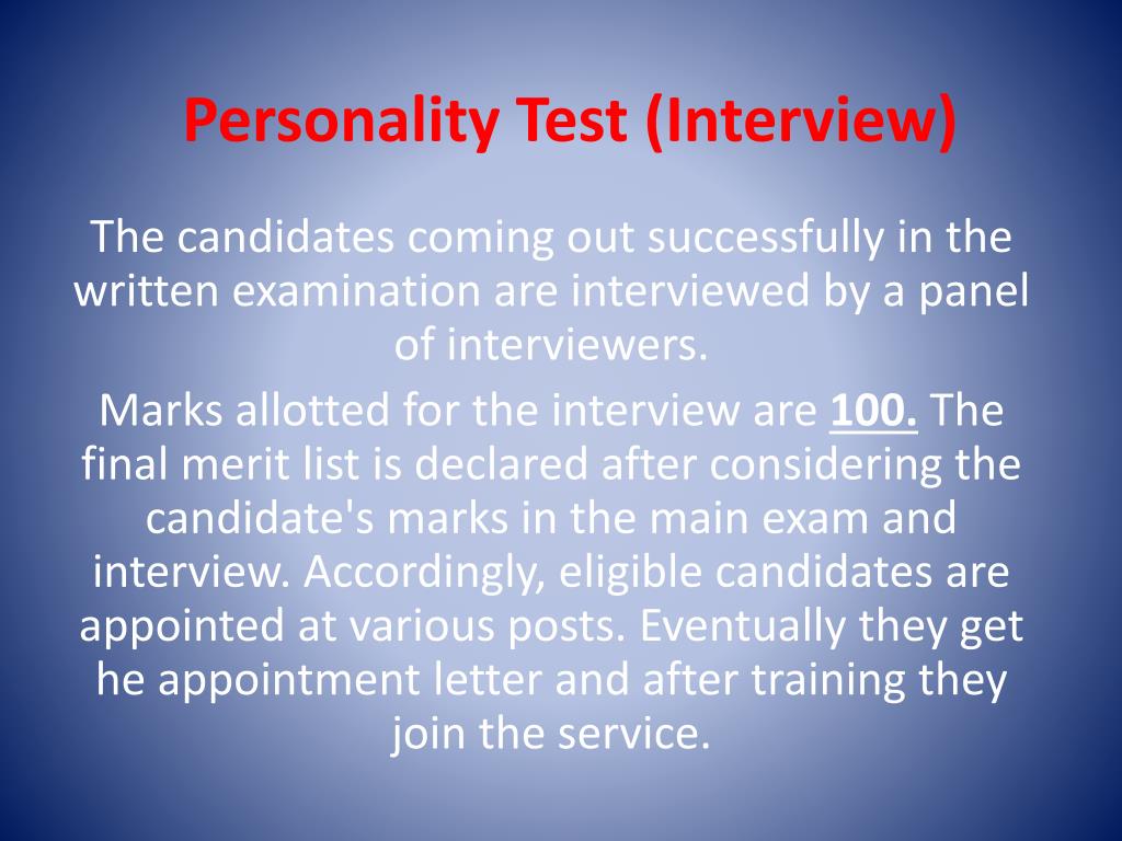 Personality Test (Interview) The candidates coming out successfully in the written examination are interviewed by a panel of interviewers. Marks allotted for the interview are 100. The final merit list is declared after considering the candidate's marks in the main exam and interview. Accordingly, eligible candidates are appointed at various posts. Eventually they get he appointment letter and after training they join the service.