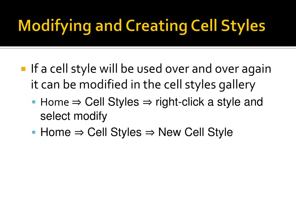 Modifying and Creating Cell Styles • If a cell style will be used over and over again it can be modified in the cell styles gallery • Home ⇒ Cell Styles ⇒ right-click a style and select modify • Home ⇒ Cell Styles ⇒ New Cell Style