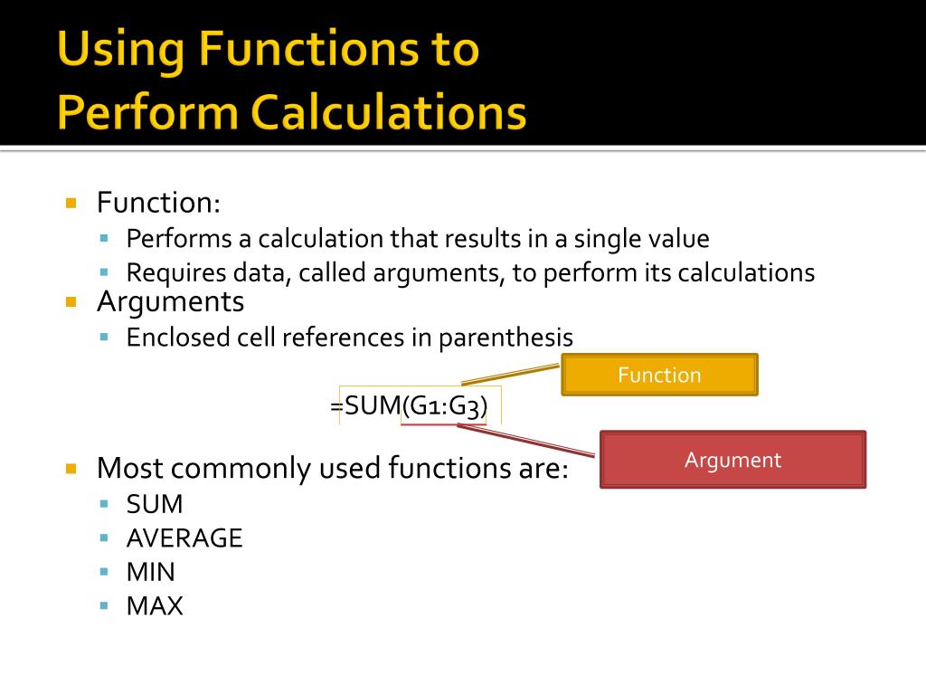 Using Functions to Perform Calculations • Function: • Performs a calculation that results in a single value • Requires data, called arguments, to perform its calculations • Arguments • Enclosed cell references in parenthesis =SUM(G1:G3) • Most commonly used functions are: • SUM • AVERAGE • MIN • MAX Function Argument
