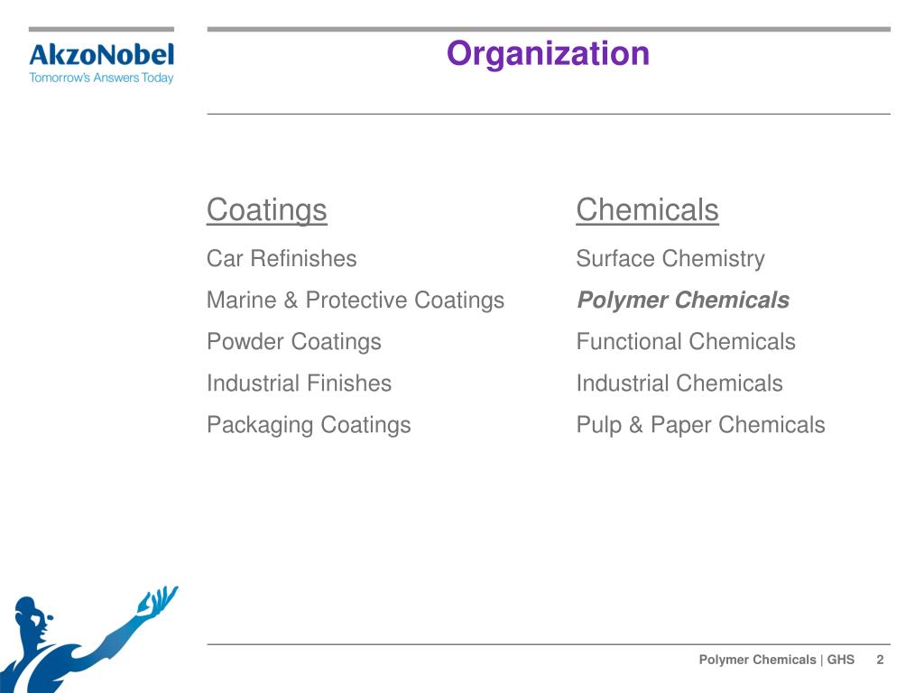 Organization • CoatingsChemicals • Car Refinishes Surface Chemistry • Marine & Protective Coatings Polymer Chemicals • Powder Coatings Functional Chemicals • Industrial Finishes Industrial Chemicals • Packaging Coatings Pulp & Paper Chemicals Polymer Chemicals | GHS