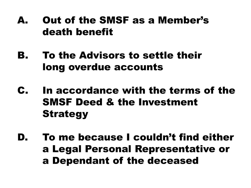 Out of the SMSF as a Member’s death benefit B. To the Advisors to settle their long overdue accounts C. In accordance with the terms of the SMSF Deed & the Investment Strategy D. To me because I couldn’t find either a Legal Personal Representative or a Dependant of the deceased