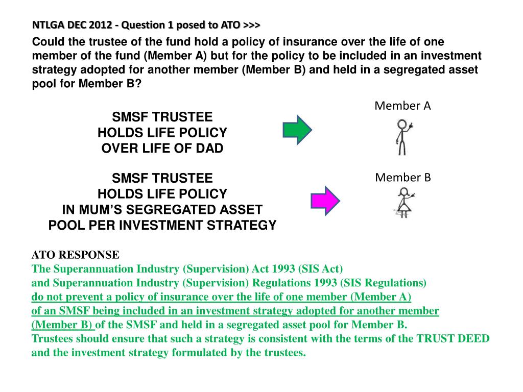 NTLGA DEC 2012 - Question 1 posed to ATO >>> Could the trustee of the fund hold a policy of insurance over the life of one member of the fund (Member A) but for the policy to be included in an investment strategy adopted for another member (Member B) and held in a segregated asset pool for Member B? Member A SMSF TRUSTEE HOLDS LIFE POLICY OVER LIFE OF DAD Member B SMSF TRUSTEE HOLDS LIFE POLICY IN MUM’S SEGREGATED ASSET POOL PER INVESTMENT STRATEGY • ATO RESPONSE • The Superannuation Industry (Supervision) Act 1993 (SIS Act) • and Superannuation Industry (Supervision) Regulations 1993 (SIS Regulations) • do not prevent a policy of insurance over the life of one member (Member A) • of an SMSF being included in an investment strategy adopted for another member • (Member B) of the SMSF and held in a segregated asset pool for Member B. • Trustees should ensure that such a strategy is consistent with the terms of the TRUST DEED • and the investment strategy formulated by the trustees.