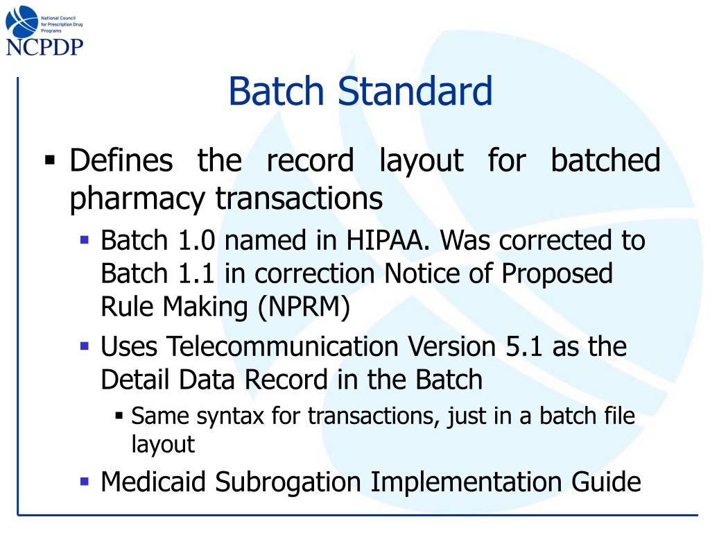Batch Standard • Defines the record layout for batched pharmacy transactions • Batch 1.0 named in HIPAA. Was corrected to Batch 1.1 in correction Notice of Proposed Rule Making (NPRM) • Uses Telecommunication Version 5.1 as the Detail Data Record in the Batch • Same syntax for transactions, just in a batch file layout • Medicaid Subrogation Implementation Guide