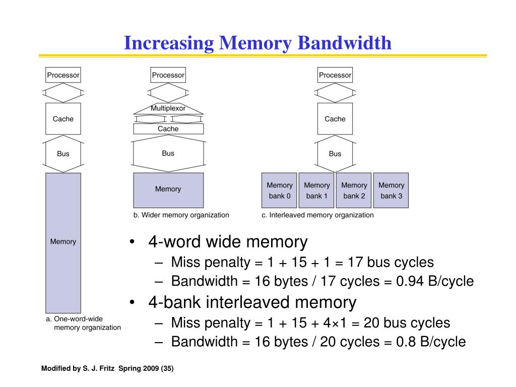 Designing the Memory System Three options: • Memory is one word wide and all accesses are sequential • Widen memory and bus for parallel access to multiple words • Increase the bandwidth by widening the connection, but not the bus – allows all to be read simultaneously. Called interleaving (See diagram on next slide) Modified by S. J. Fritz Spring 2009 (34)