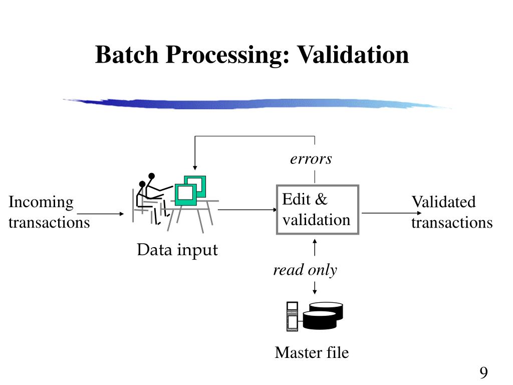 Batch Processing: Validation errors Edit & validation Incoming transactions Validated transactions Data input read only Master file