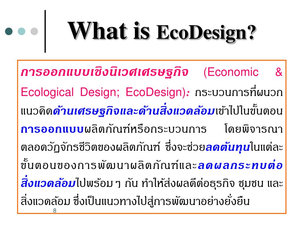 What is EcoDesign? การออกแบบเชิงนิเวศเศรษฐกิจ (Economic & Ecological Design; EcoDesign):กระบวนการที่ผนวกแนวคิดด้านเศรษฐกิจและด้านสิ่งแวดล้อมเข้าไปในขั้นตอนการออกแบบผลิตภัณฑ์หรือกระบวนการ โดยพิจารณาตลอดวัฏจักรชีวิตของผลิตภัณฑ์ ซึ่งจะช่วยลดต้นทุนในแต่ละขั้นตอนของการพัฒนาผลิตภัณฑ์และลดผลกระทบต่อสิ่งแวดล้อมไปพร้อมๆ กัน ทำให้ส่งผลดีต่อธุรกิจ ชุมชน และสิ่งแวดล้อม ซึ่งเป็นแนวทางไปสู่การพัฒนาอย่างยั่งยืน