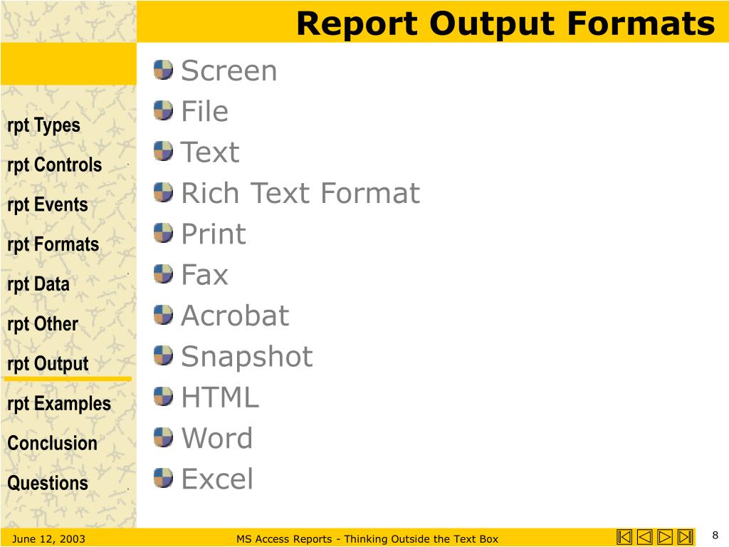 Report Output Formats • Screen • File • Text • Rich Text Format • Print • Fax • Acrobat • Snapshot • HTML • Word • Excel MS Access Reports - Thinking Outside the Text Box