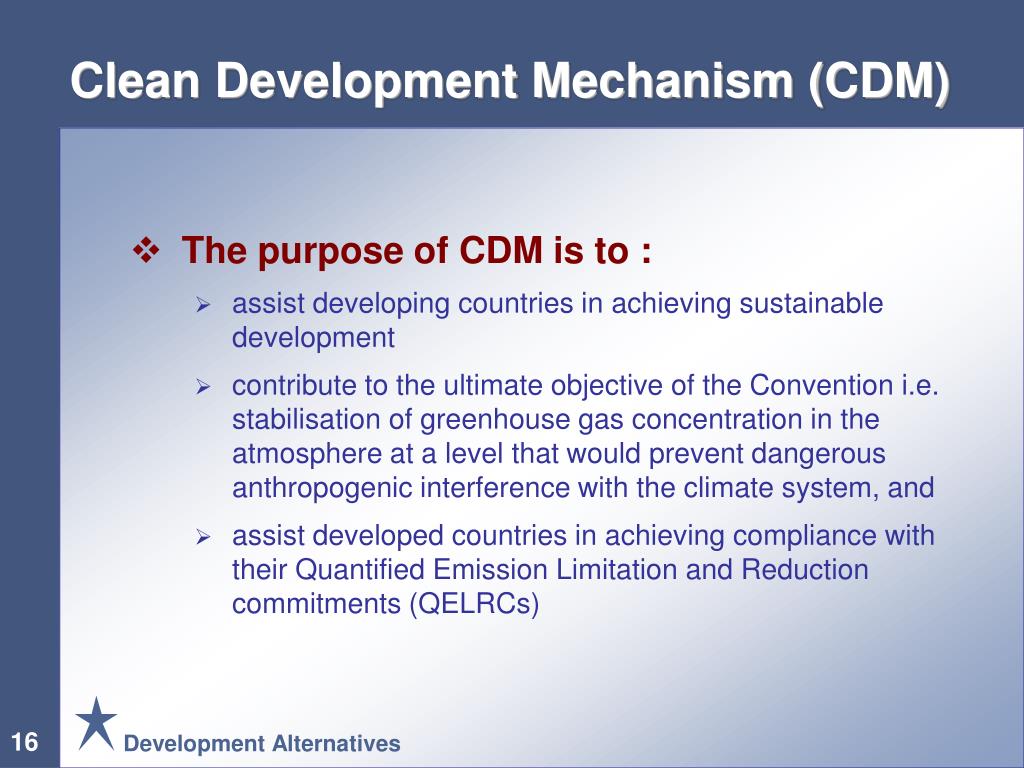 Clean Development Mechanism (CDM) • The purpose of CDM is to : • assist developing countries in achieving sustainable development • contribute to the ultimate objective of the Convention i.e. stabilisation of greenhouse gas concentration in the atmosphere at a level that would prevent dangerous anthropogenic interference with the climate system, and • assist developed countries in achieving compliance with their Quantified Emission Limitation and Reduction commitments (QELRCs)
