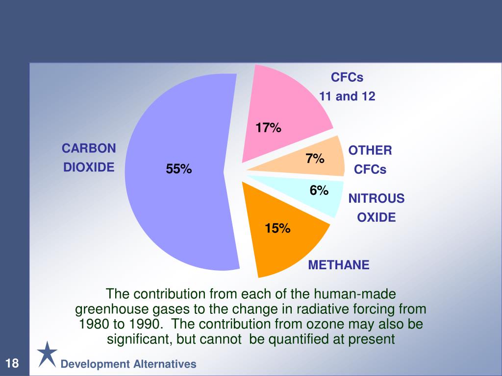 CFCs 11 and 12 CARBON DIOXIDE OTHER CFCs NITROUS OXIDE METHANE The contribution from each of the human-made greenhouse gases to the change in radiative forcing from 1980 to 1990. The contribution from ozone may also be significant, but cannot be quantified at present