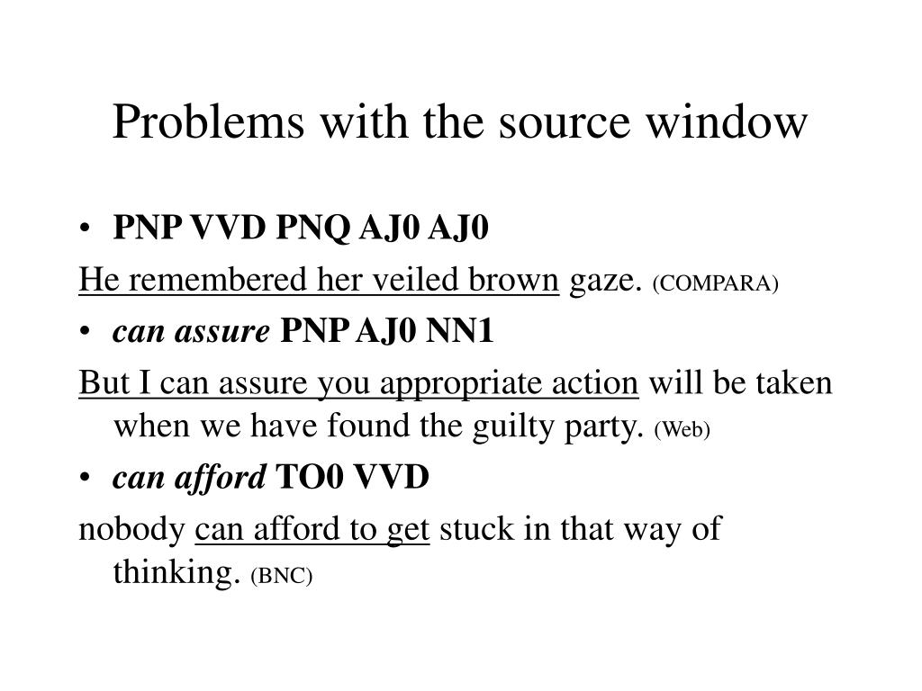 Problems with the source window • PNP VVD PNQ AJ0 AJ0 He remembered her veiled brown gaze. (COMPARA) • canassure PNP AJ0 NN1 But I can assure you appropriate action will be taken when we have found the guilty party. (Web) • canafford TO0 VVD nobody can afford to get stuck in that way of thinking. (BNC)