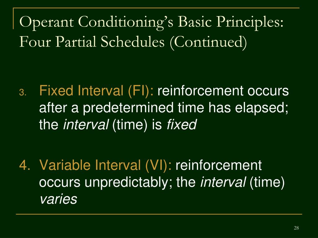 Operant Conditioning’s Basic Principles: Four Partial Schedules (Continued) • Fixed Interval (FI):reinforcement occurs after a predetermined time has elapsed; the interval (time) is fixed 4. Variable Interval (VI):reinforcement occurs unpredictably; the interval (time) varies