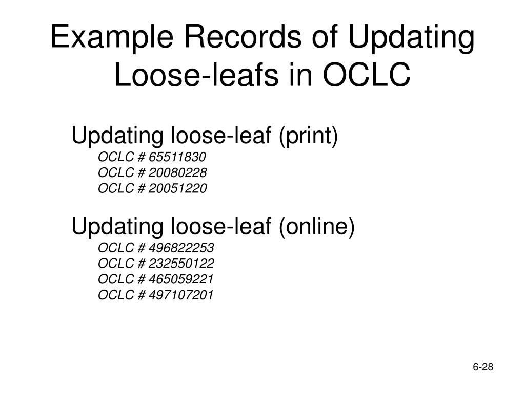 Example Records of Updating Loose-leafs in OCLC • Updating loose-leaf (print) • OCLC # 65511830 • OCLC # 20080228 • OCLC # 20051220 • Updating loose-leaf (online) • OCLC # 496822253 • OCLC # 232550122 • OCLC # 465059221 • OCLC # 497107201