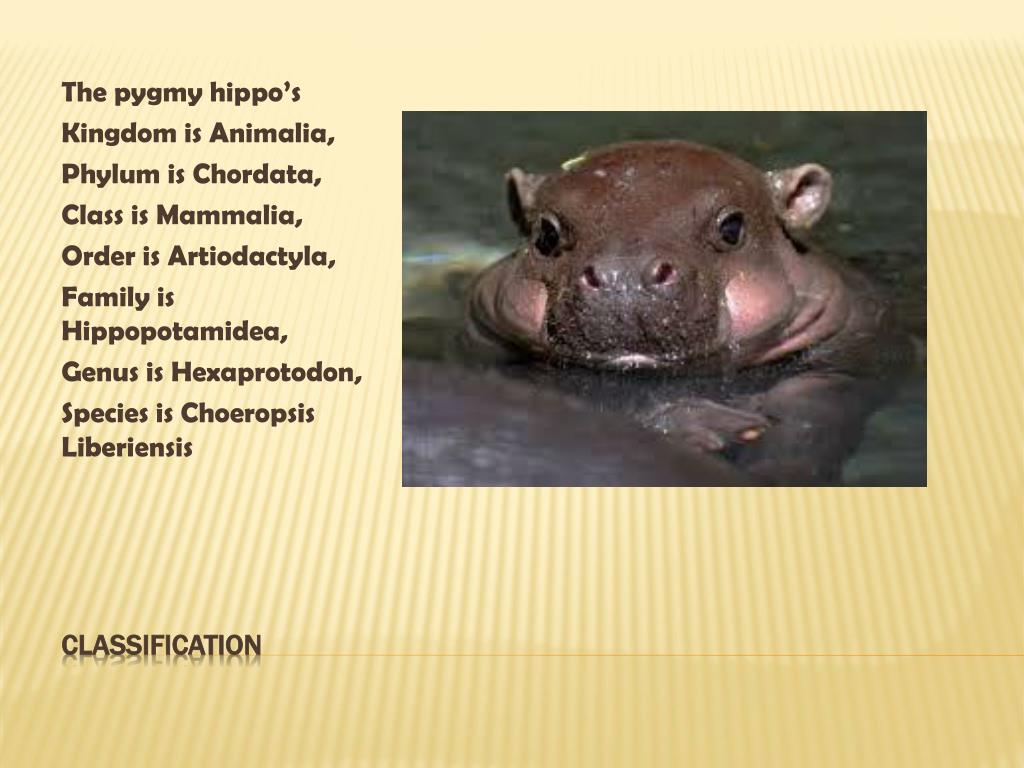 The pygmy hippo’s Kingdom is Animalia, Phylum is Chordata, Class is Mammalia, Order is Artiodactyla, Family is Hippopotamidea, Genus is Hexaprotodon, Species is ChoeropsisLiberiensis CLASSIFICATION