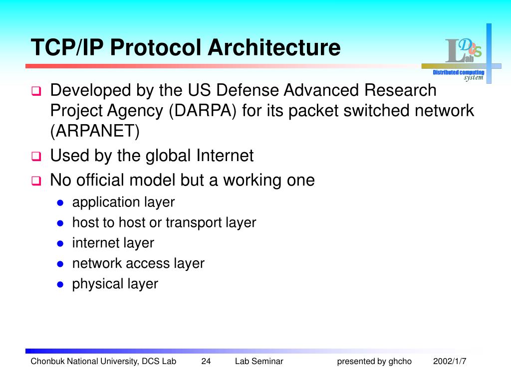 TCP/IP Protocol Architecture • Developed by the US Defense Advanced Research Project Agency (DARPA) for its packet switched network (ARPANET) • Used by the global Internet • No official model but a working one • application layer • host to host or transport layer • internet layer • network access layer • physical layer