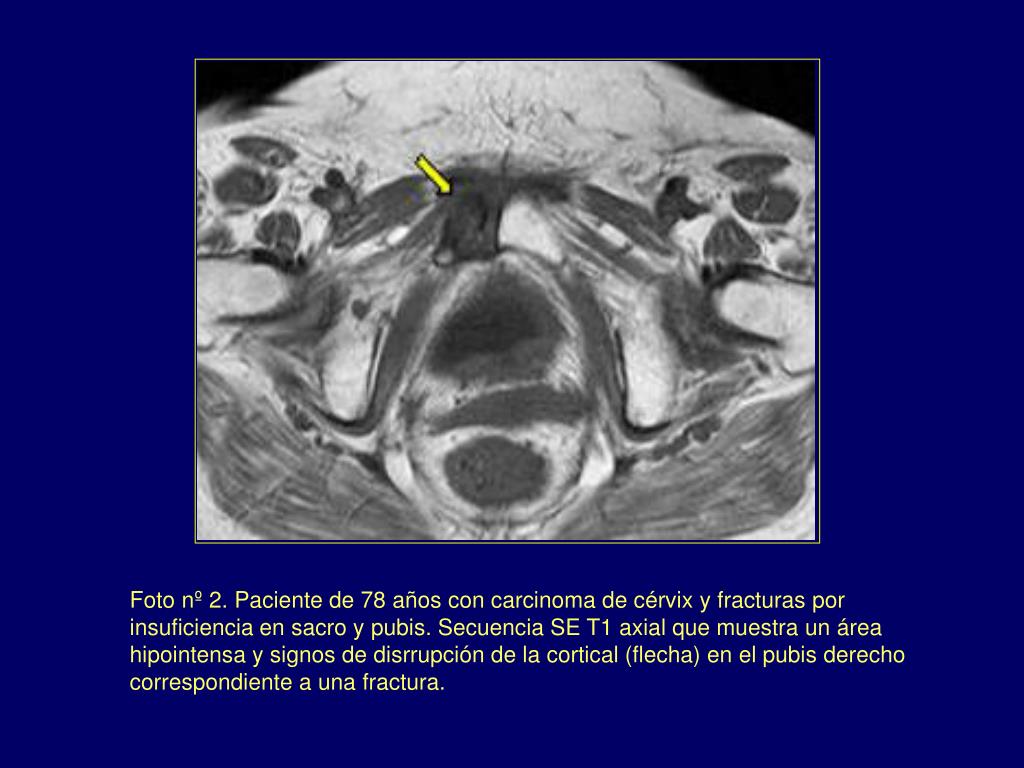 Foto nº 2. Paciente de 78 años con carcinoma de cérvix y fracturas por insuficiencia en sacro y pubis. Secuencia SE T1 axial que muestra un área hipointensa y signos de disrrupción de la cortical (flecha) en el pubis derecho correspondiente a una fractura.
