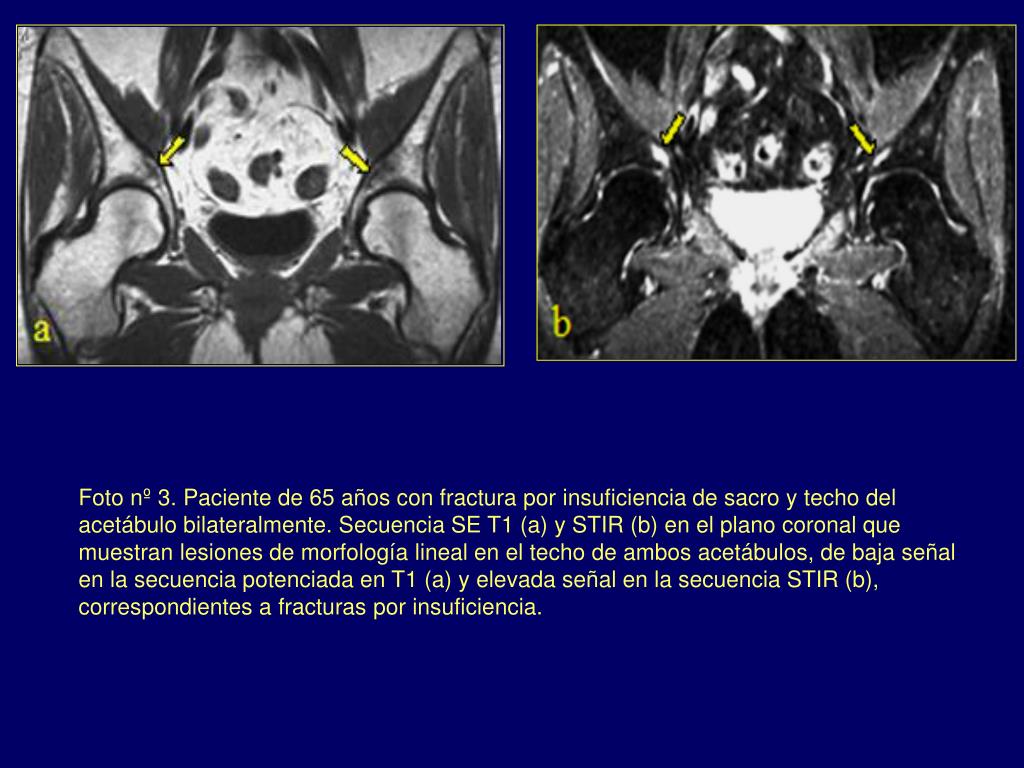 Foto nº 3. Paciente de 65 años con fractura por insuficiencia de sacro y techo del acetábulo bilateralmente. Secuencia SE T1 (a) y STIR (b) en el plano coronal que muestran lesiones de morfología lineal en el techo de ambos acetábulos, de baja señal en la secuencia potenciada en T1 (a) y elevada señal en la secuencia STIR (b), correspondientes a fracturas por insuficiencia.